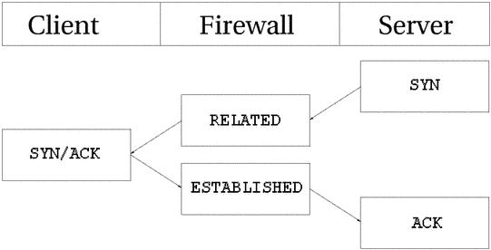 The solution to this problem is to add a special helper to the connection tracking module which will scan through the data in the control connection for specific syntaxes and information. When it runs into the correct information, it will add that specific information as RELATED and the server will be able to track the connection, thanks to that RELATED entry. Consider the following picture to understand the states when the FTP server has made the connection back to the client.