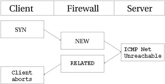 In the above example, we send out a SYN packet to a specific address. This is considered as a NEW connection by the firewall. However, the network the packet is trying to reach is unreachable, so a router returns a network unreachable ICMP error to us. The connection tracking code can recognize this packet as RELATED. thanks to the already added tracking entry, so the ICMP reply is correctly sent to the client which will then hopefully abort. Meanwhile, the firewall has destroyed the connection tracking entry since it knows this was an error message.