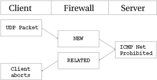 This time an UDP packet is sent to the host. This UDP connection is considered as NEW. However, the network is administratively prohibited by some firewall or router on the way over. Hence, our firewall receives a ICMP Network Prohibited in return. The firewall knows that this ICMP error message is related to the already opened UDP connection and sends it as an RELATED packet to the client. At this point, the firewall destroys the connection tracking entry, and the client receives the ICMP message and should hopefully abort.