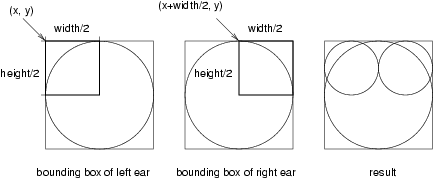public static void main (String[] args) {The parameters for draw are the Graphics object and a bounding box. draw invokes drawOval three times, to draw Mickey's face and two ears. The following figure shows the bounding boxes for the ears.