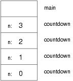 countdown (3);The execution of countdown begins with n=3, and since n is not zero, it prints the value 3, and then invokes itself...