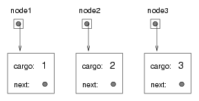 Node node1 = new Node (1, null);This code creates three nodes, but we don't have a list yet because the nodes are not linked. The state diagram looks like this: