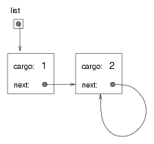 There is nothing to prevent a node from referring back to an earlier node in the list, including itself. For example, this figure shows a list with two nodes, one of which refers to itself.