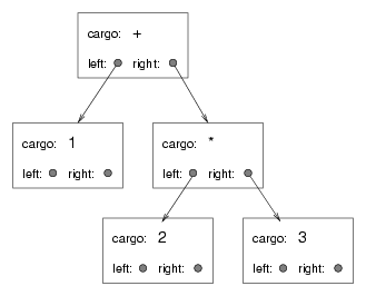 The nodes can be operands like 1 and 2 or operators like + and *. Operands are leaf nodes; operator nodes contain references to their operands (all of these operators are binary, meaning they have exactly two operands).