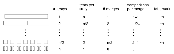 The first two columns of the table show the number of arrays at each level and the number of items in each array. The third column shows the number of merges that take place at each level of recursion. The next column is the one that takes the most thought: it shows the number of comparisons each merge performs.