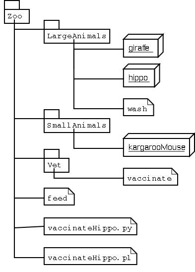 Zope locates the scripts you call using acquisition the same way it does when calling scripts from the web. Returning to our hippo feeding example of the last section, let's see how to vaccinate a hippo from Python and Perl. Figure 8-2 shows a slightly updated object hierarchy that contains two scripts, vaccinateHippo.py and vaccinateHippo.pl.