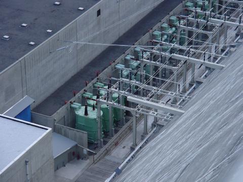 The following photograph shows a bank of step-up transformers at the Grand Coulee hydroelectric dam in Washington state. Several transformers (green in color) may be seen from this vantage point, and they are grouped in threes: three transformers per hydroelectric generator, wired together in some form of three-phase configuration. The photograph doesn't reveal the primary winding connections, but it appears the secondaries are connected in a Y configuration, being that there is only one large high-voltage insulator protruding from each transformer. This suggests the other side of each transformer's secondary winding is at or near ground potential, which could only be true in a Y system. The building to the left is the powerhouse, where the generators and turbines are housed. On the right, the sloping concrete wall is the downstream face of the dam: