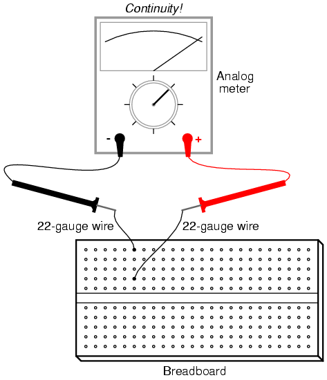 Use your meter to determine continuity between the holes on a breadboard: a device used for temporary construction of circuits, where component terminals are inserted into holes on a plastic grid, metal spring clips underneath each hole connecting certain holes to others. Use small pieces of 22-gauge solid copper wire, inserted into the holes of the breadboard, to connect the meter to these spring clips so that you can test for continuity: